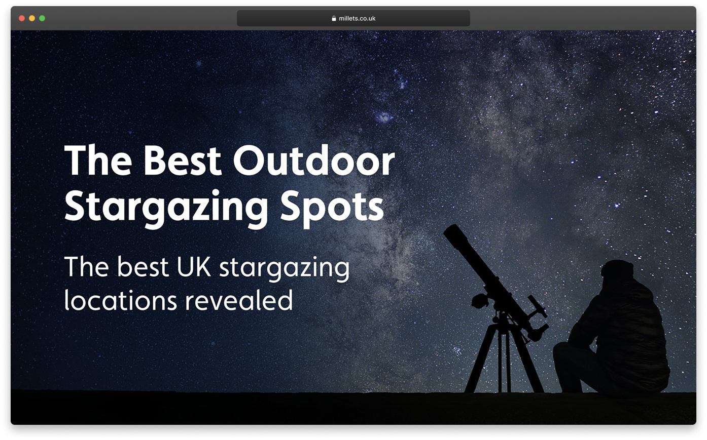 In 2024, we launched eight creative, data-driven hero campaigns for Millets, with The Best Outdoor Stargazing Spots being one of the standout successes.