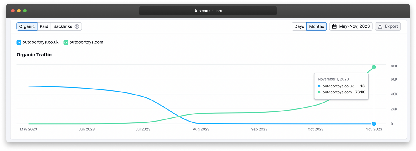Learn how we successfully recovered (and grew) the organic traffic for Outdoor Toys, one of the UK’s largest stockists of children’s toys and play equipment, following a .co.uk to .com domain migration that resulted in an initial downturn in visibility.