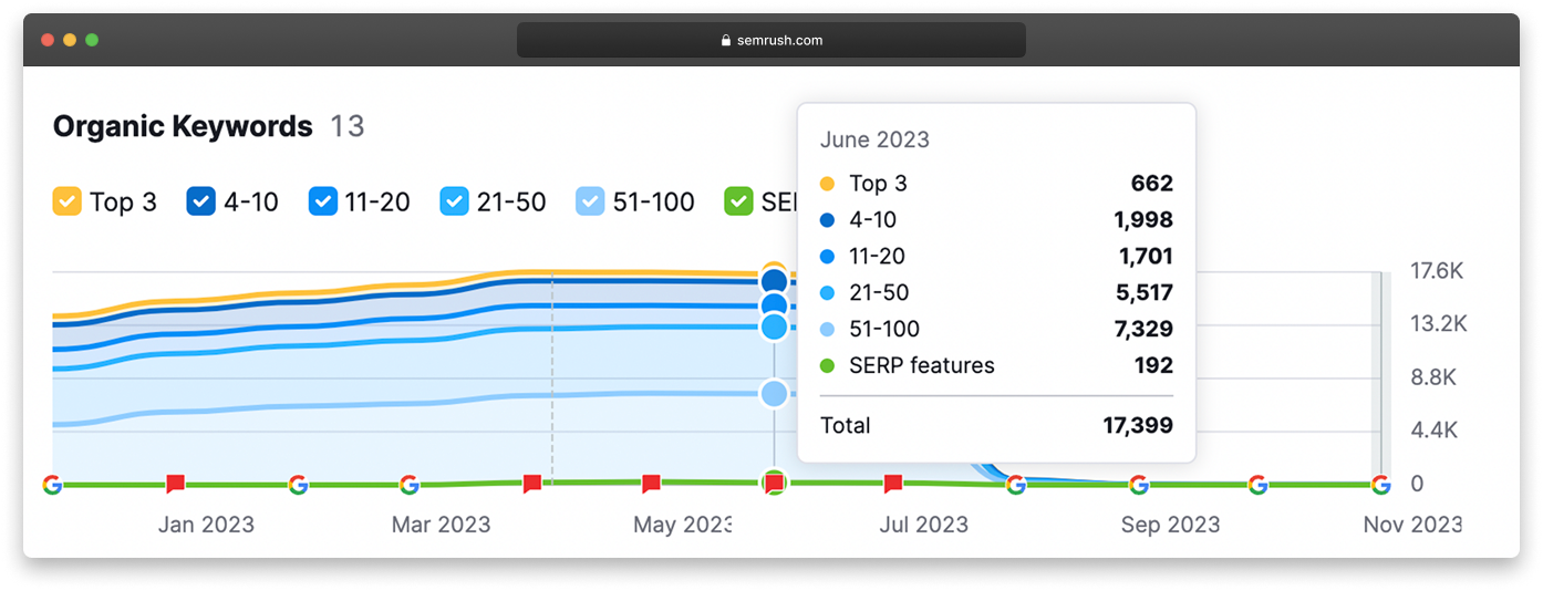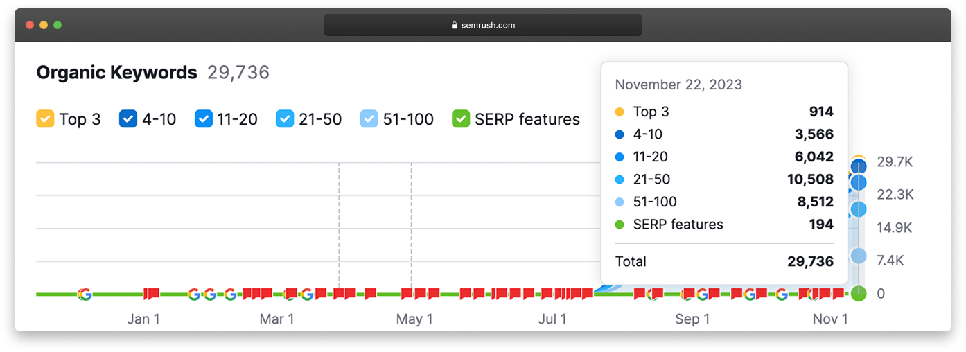 Four months after the migration, by November 2023, we saw the site’s visibility surpass what had held immediately before the changes. Outdoor Toys’ .com domain ranks in top three positions for 914 keywords, with a total of 4,480 on page one of Google. Additionally, a total of 6,042 keywords now rank on page two of Google, significantly increasing our group of striking distance queries to focus our efforts on.