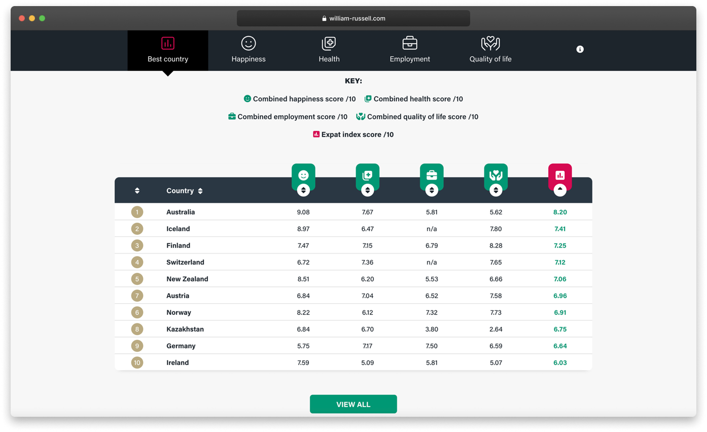 Specifically, we included an interactive table that users could sort by the different factor groupings, in turn revealing not just which countries came out top overall but under the happiness, health, employment and quality of life factors.